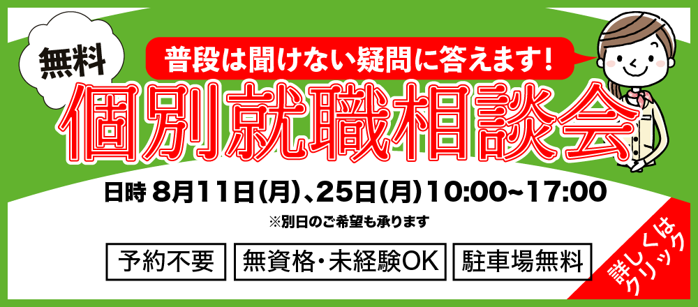 - いいえ、そんなことはございません!募集内容にご納得いただき、「ココが良い!」「応募したい!!」と思った時にご応募ください。お仕事が決まるまでトコトンご紹介いたします。