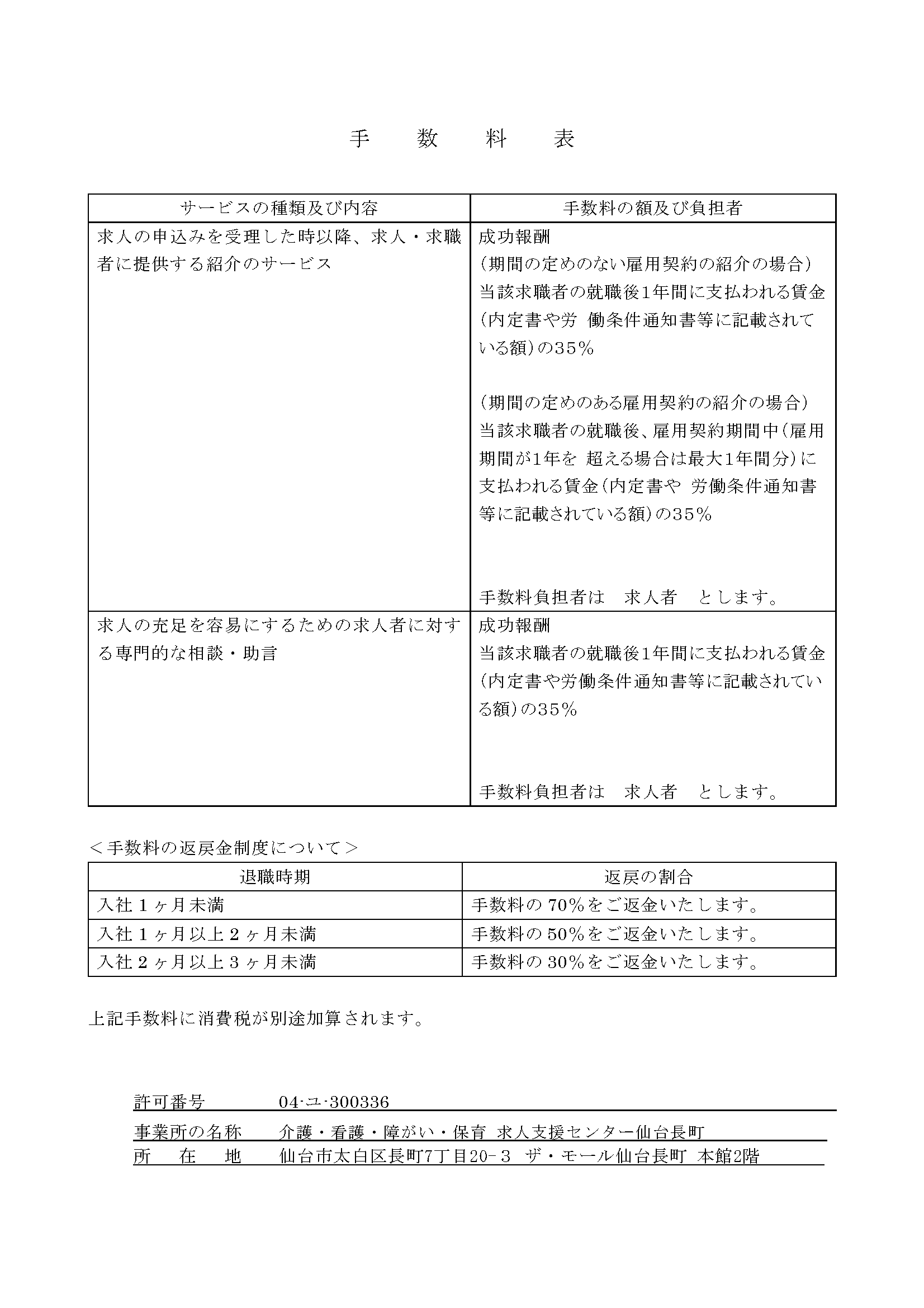 手数料表(返戻金制度)